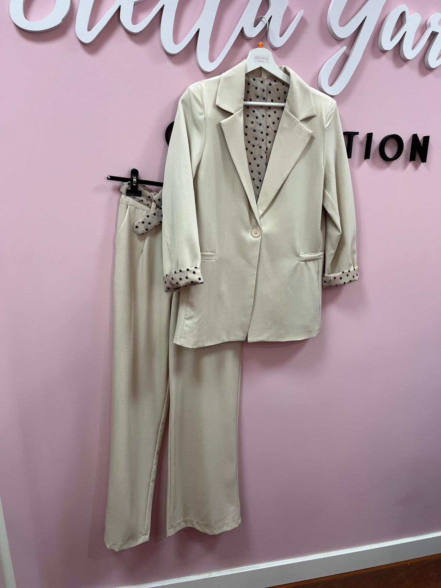 Traje de pantalon con forro en topitos y cinturon a juego.