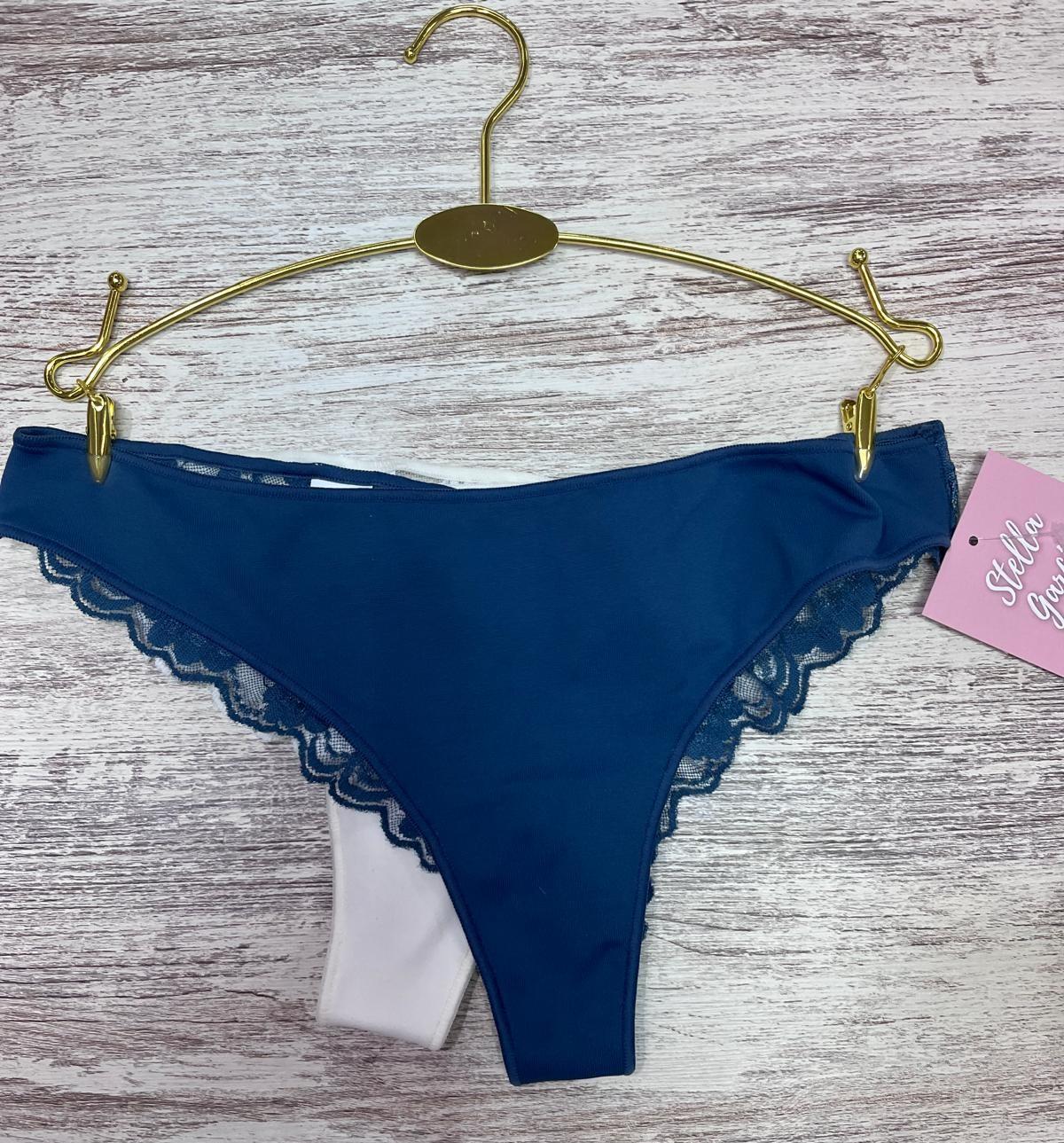 Braga tanga brasileña de finísima y elegante blonda en la parte trasera y tejido liso en la parte delantera.