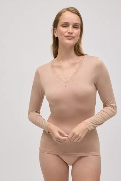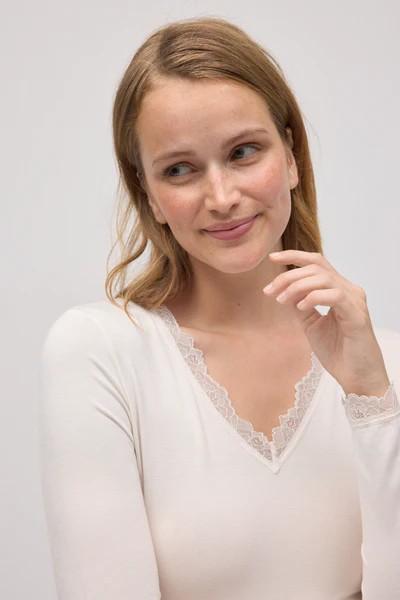 Camiseta ligera y extremadamente suave, con escote en pico con detalle de encaje, diseñada para ofrecer una sensación de confort absoluto durante todo el día.