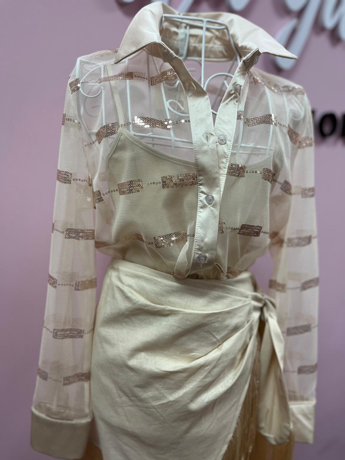 Blusa en tul con apliques en lentejuelas y cuellos y puños en raso, talla unica hasta 40 aproximadamente